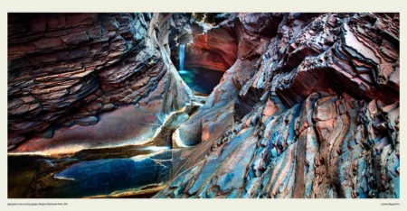 This dramatic photo showcases the iconic banded iron formations of Karijini National Park. A winding gorge leads to a secluded waterfall and serene pools of water, highlighting the contrast between the ancient, ochre-colored cliffs and the refreshing blue tones of the water. Perfect for home or office decor, our fine art prints bring the breathtaking natural beauty of Spa pool, Hamersley gorge.